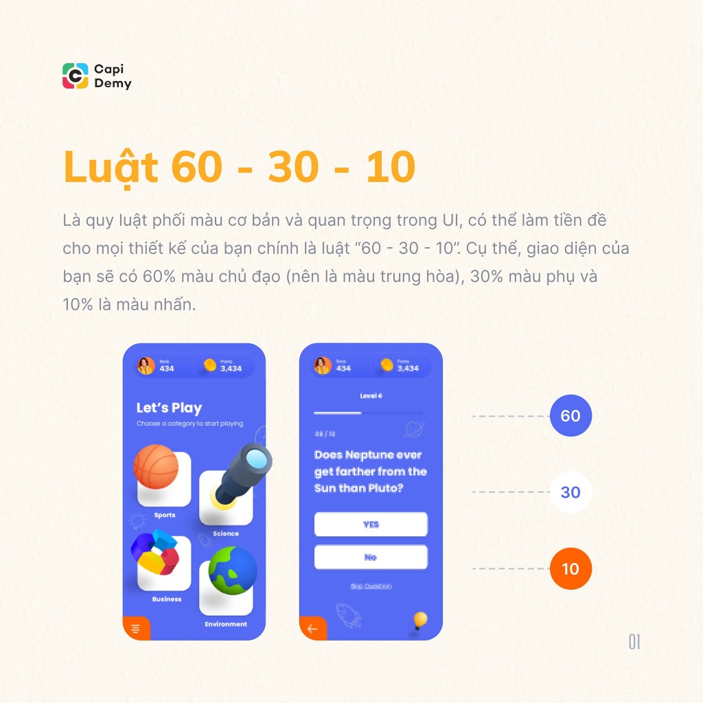Khi bạn càng chuyên sâu vào thiết kế UI, bạn sẽ càng ngày càng có nhiều sự lựa chọn phối màu cho các thiết kế của mình được đa dạng và đẹp mắt. Nhưng nếu kể tên một nguyên tắc phối màu cơ bản trong thiết kế UI mà bạn phải nhớ, chỉ có duy nhất một luật quan trọng sẽ làm tiền đề cho mọi thiết kế của bạn. Đó chính là luật “60 - 30 - 10”.