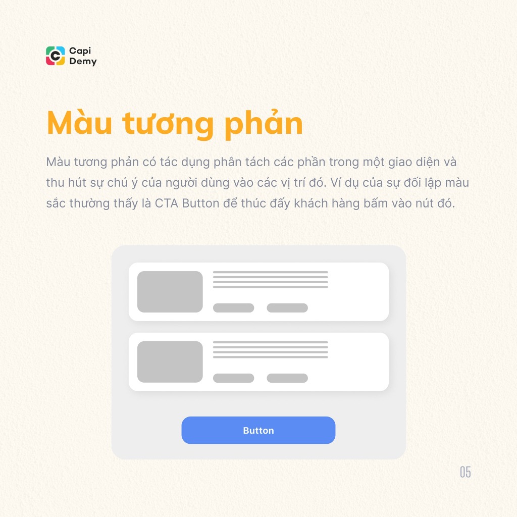 Gợi ý cuối của chúng mình để giúp bạn sử dụng màu sắc được tối ưu đó chính là lựa chọn kết hợp giữa các màu tương phản với nhau. Màu tương phản có tác dụng phân tách các phần trong một giao diện và thu hút sự chú ý của người dùng vào các vị trí đó.
