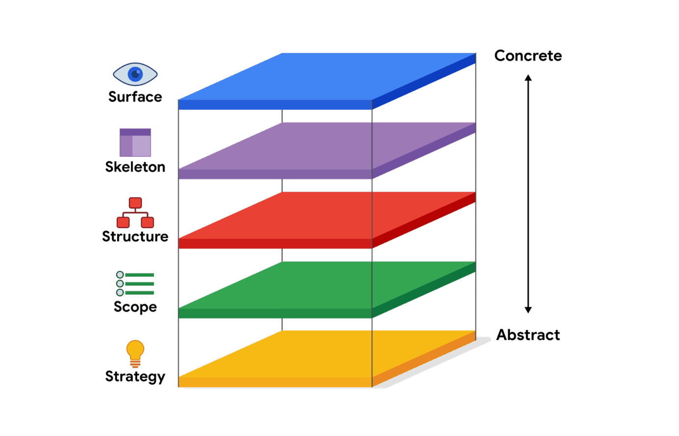 Năm yếu tố của thiết kế UX là một khung các bước mà các nhà thiết kế UX thực hiện để biến một ý tưởng thành một sản phẩm hoạt động. Năm yếu tố, từ dưới lên trên: chiến lược, phạm vi, cấu trúc, khung và bề mặt. Hãy coi đây là một tập hợp năm lớp, trong đó mỗi lớp phụ thuộc vào lớp bên dưới nó.