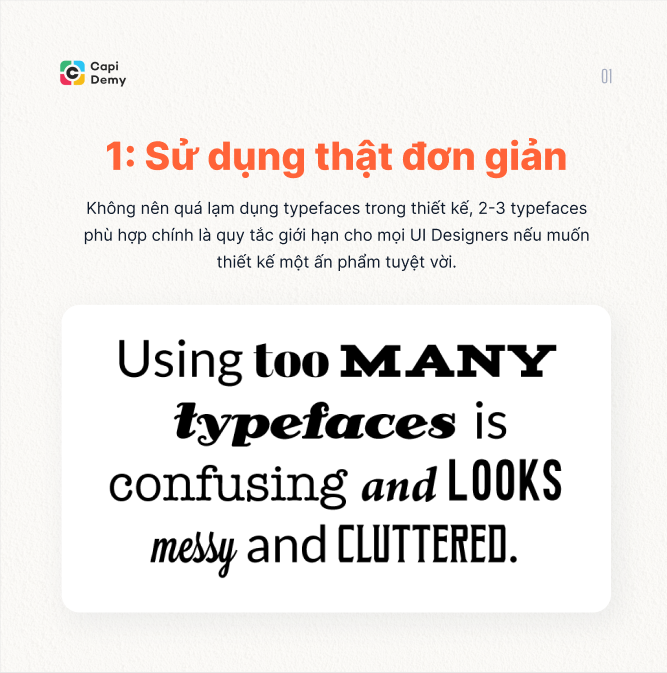 Số lượng phông chữ tốt nhất dành cho thiết kế là 2-3 typefaces, và đây cũng là giới hạn trong luật sử dụng các phông chữ dành cho UI Designers. Ngoài ra, các phông chữ bạn chọn nên có sự tương đồng đến chủ đề của ấn phẩm và nên bổ trợ lẫn nhau.