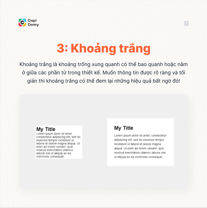 White Space là khoảng trống xung quanh có thể bao quanh hoặc nằm ở giữa các phần tử trong thiết kế. Những vùng trống này hiểu đơn giản là “không có nội dung”. Khoảng trắng tất nhiên không nhất thiết là vùng không màu trắng, miễn là nó thể hiện được tính trống trong thiết kế, thậm chí nó có thể có họa tiết để thêm nổi bật hơn.