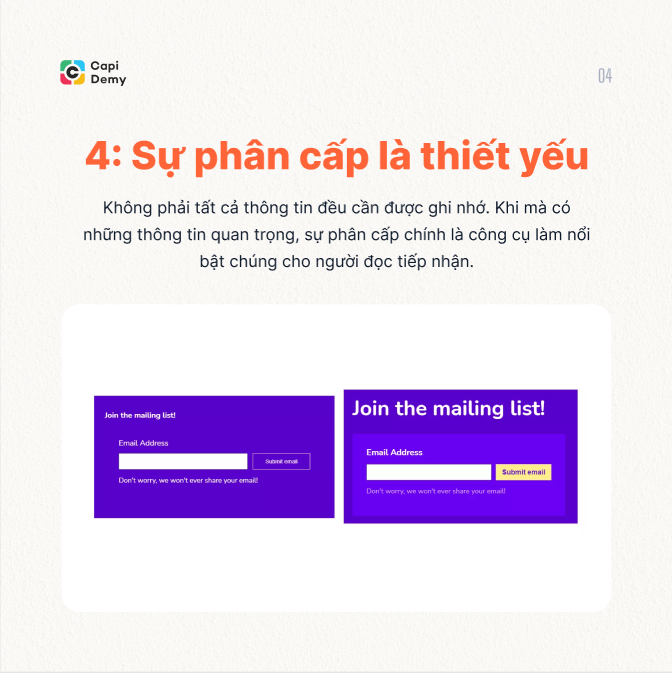 Để phân cấp bố cục, các Designers thường tận dụng sự tương phản giữa các yếu tố trong thiết kế. Sự tương phản về màu sắc, kích thước hoặc vị trí đều giúp người xem tập trung đến và tiếp thu thông tin tốt hơn. Bởi vì sau cùng, không phải tất cả mọi thứ đều cần nhận được sự chú ý đồng đều. Hãy tận dụng tốt sự khác biệt giữa các size chứ, màu sắc tương phản và nổi bật hay bố cục giao diện để thu hút người truy cập, tạo ra sự khác biệt nếu muốn nổi bật chúng.