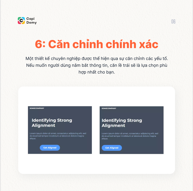 Căn chỉnh cung cấp một cấu trúc gắn kết và gọn gàng cho thiết kế, chúng tạo sự cân bằng và điều hướng cho khách hàng. Và trên hết, trong bất kì dự án nào, căn chỉnh giúp thiết kế của bạn trở nên chuyên nghiệp hơn, được đánh giá cao hơn so với việc không sử dụng chúng. Hãy tùy vào hoàn cảnh để chọn cách căn chỉnh phù hợp nhất nhé!