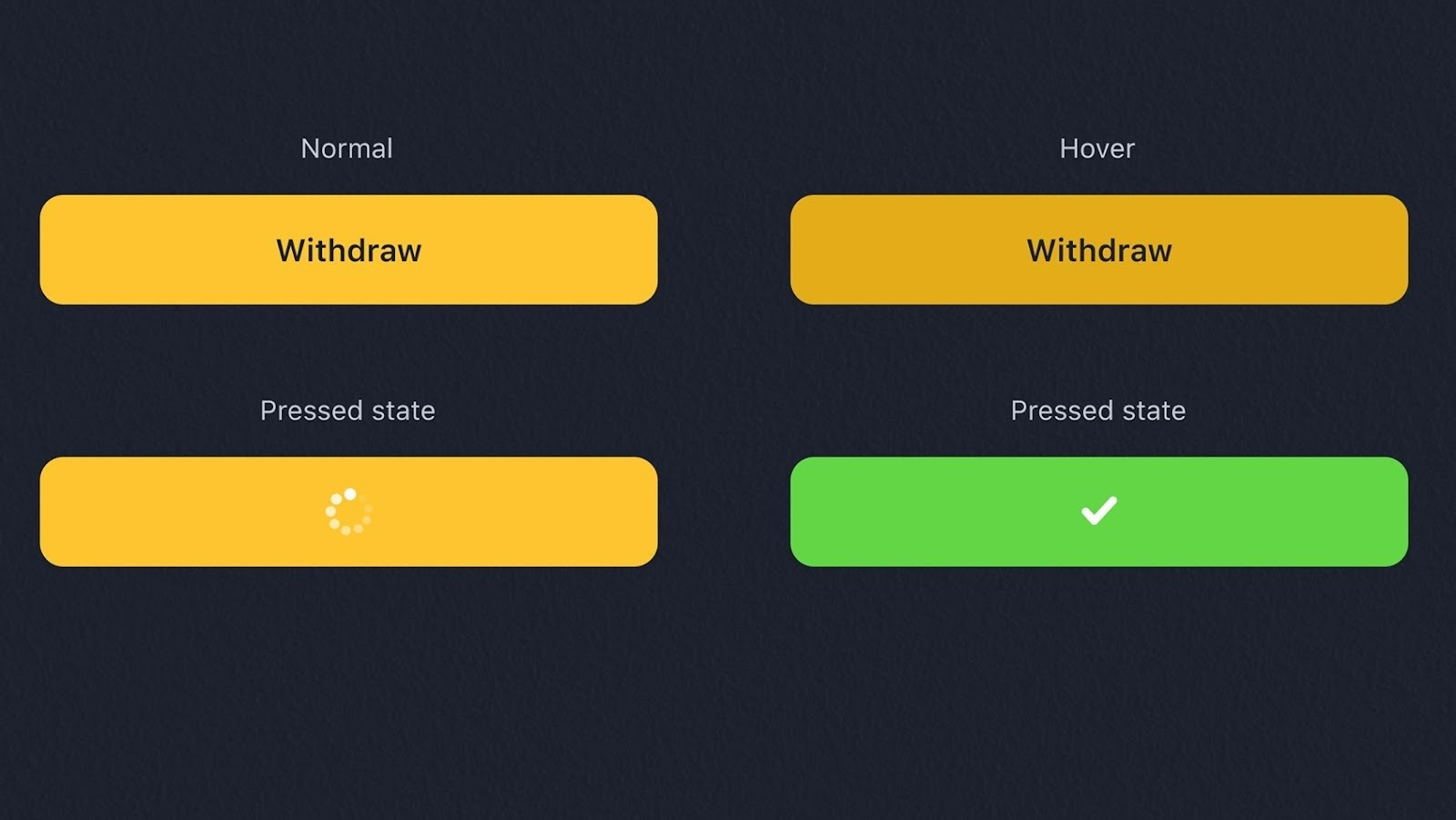 Mỗi trạng thái của Button nên được thiết kế khác nhau tương ứng với từng hành động tương tác của người dùng với nó, ví dụ như khi lướt qua (nhấn giữ) sẽ hiện trạng thái Hover, khi đã bấm vào hiển thị trạng thái Pressed (đang load hoặc hoàn thành). Những trạng thái “có thể thấy được” như vậy sẽ dễ dàng truyền tải nội dung, giúp người dùng nắm bắt rõ hành động hiện tại và có thể đoán trước hành động tiếp theo.