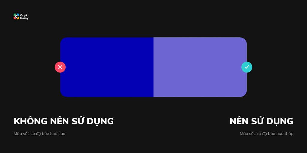 Hãy tạo một lớp màu trắng thuần #FFFFFF nhưng có độ trong suốt nhất định (Opacity < 100%) để chèn đè lên màu sắc đang có độ bão hoà cao. Từ đó, bạn sẽ có ngay một màu mang độ bão hoà thấp hơn, hiển thị rõ ràng và thuận mắt hơn với chế độ nền tối nhưng vẫn theo chuẩn tông màu thiết kế của web/app đó.