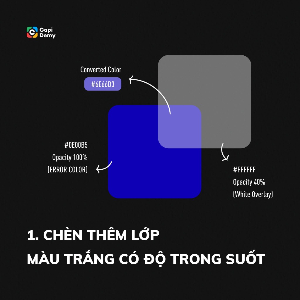 Hãy tạo một lớp màu trắng thuần #FFFFFF nhưng có độ trong suốt nhất định (Opacity < 100%) để chèn đè lên màu sắc đang có độ bão hoà cao. Từ đó, bạn sẽ có ngay một màu mang độ bão hoà thấp hơn, hiển thị rõ ràng và thuận mắt hơn với chế độ nền tối nhưng vẫn theo chuẩn tông màu thiết kế của web/app đó.