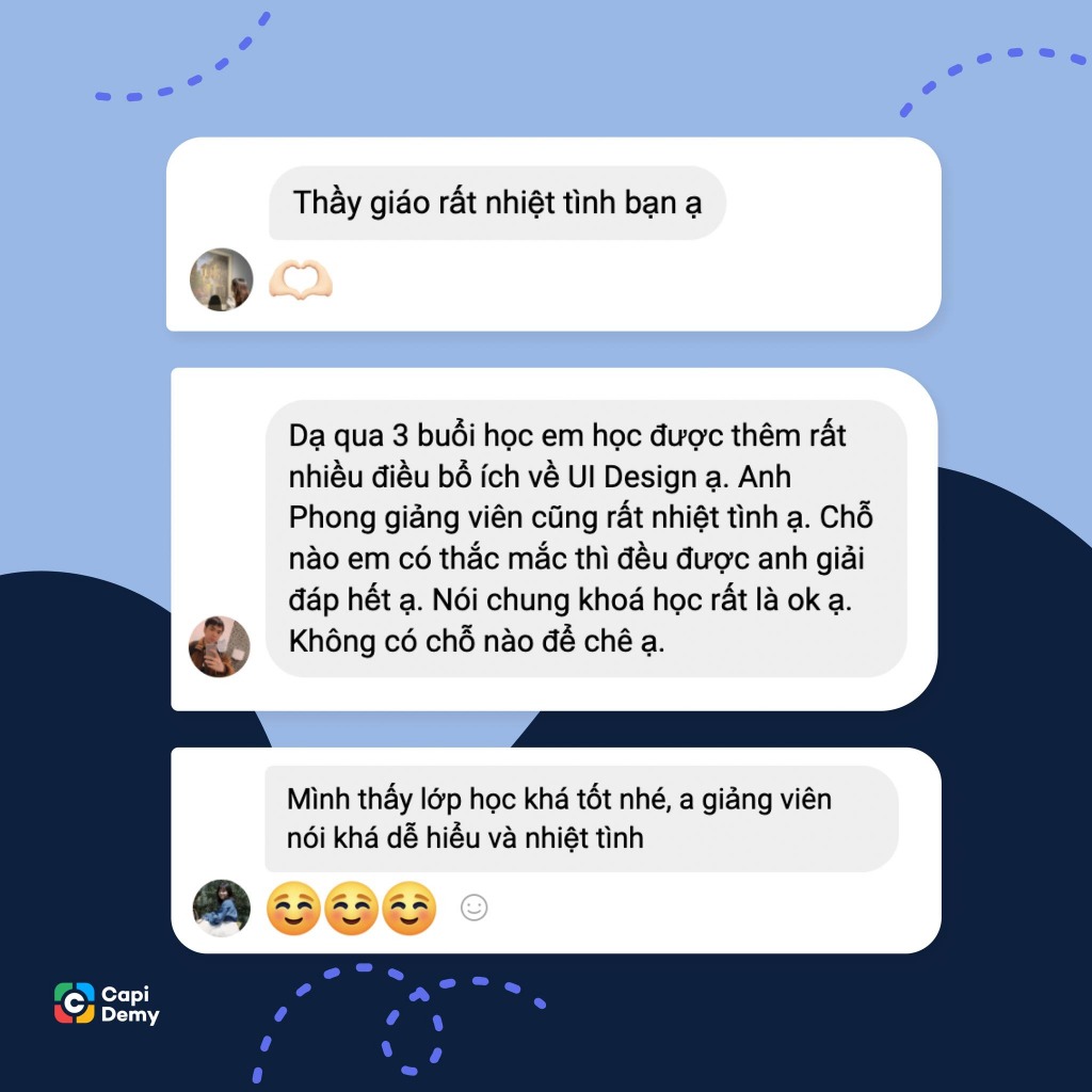 Đa số các bạn học viên lớp UI Design đều hài lòng với trải nghiệm tại Capi Demy, từ những bước đầu tư vấn, đến lúc tham gia quá trình học với nội dung khoá học, bài tập thực hành cũng như sự hỗ trợ tận tình từ trợ giảng, giảng viên đến tận cuối khoá.
