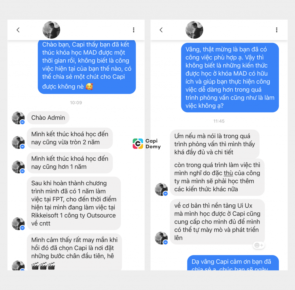 Capi Demy tự hào là một trong những đơn vị đào tạo hàng đầu cung cấp các khoá học thiết kế UI/UX tại Hà Nội, đã và đang triển khai 3 khoá học UI/UX với hình thức học online/offline linh hoạt. Để mang đến trải nghiệm học tốt nhất, đội ngũ Capi Demy không ngừng nghiên cứu cập nhật giáo trình, nâng cao chất lượng giảng dạy và sẵn sàng lắng nghe góp ý từ học viên. Chúng mình luôn cần feedback giữa khoá và cuối khoá từ các lớp là vì vậy.