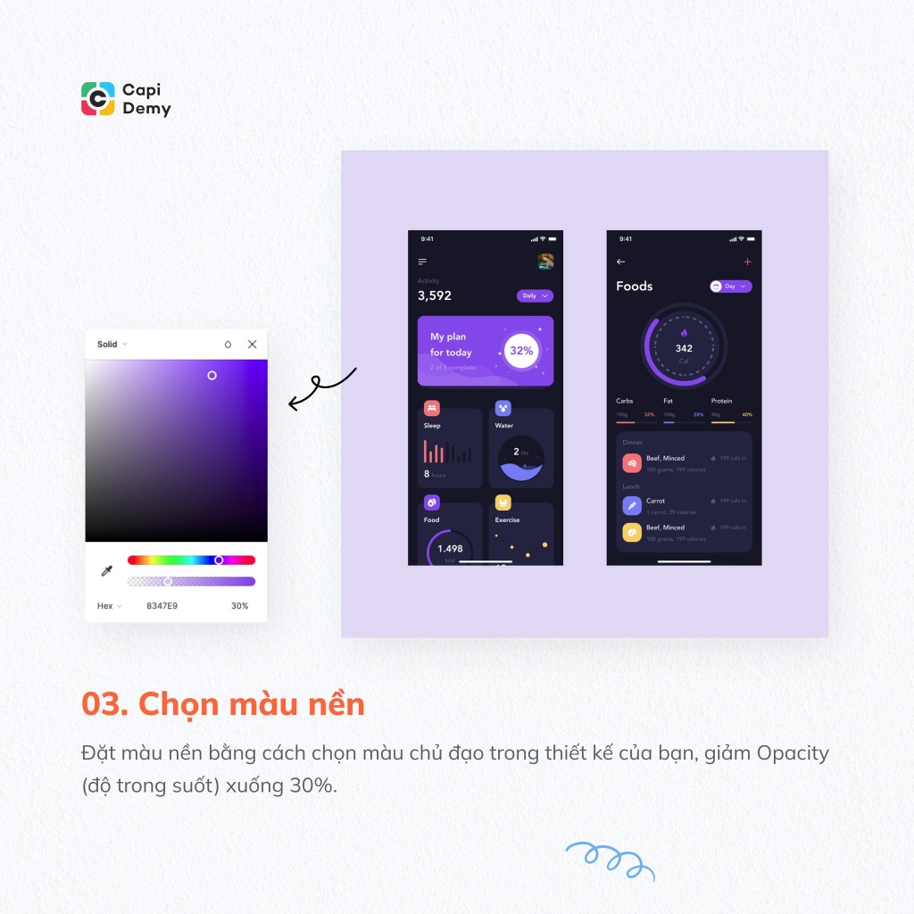 Đặt màu nền bằng cách chọn màu chủ đạo trong thiết kế của bạn, giảm Opacity (độ trong suốt) xuống 30%.