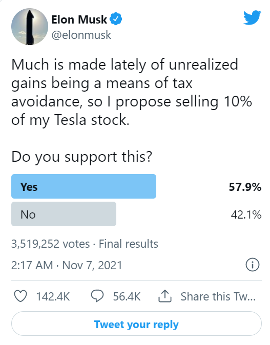 “Much is made lately of unrealized gains being a means of tax avoidance, so I propose selling 10 percent of my Tesla stock. Do you support this? ” Nguyên văn vài post của Elon Tesla. Musk đã thêm chức năng thăm dò ý kiến để người dùng có thể bỏ phiếu “Yes” hoặc “No”.