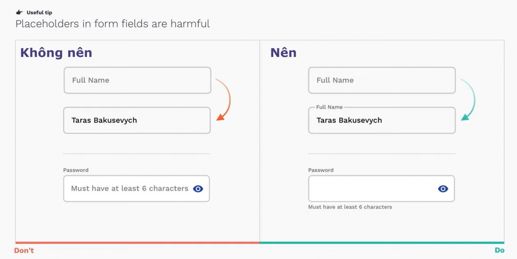 Đối với những người có trí nhớ ngắn hạn, hay những người có vấn đề về sức khỏe tâm lý, những thiết kế giao diện như hình bên trái là một điểm trừ cực mạnh. Bởi khi người dùng bắt đầu gõ chữ vào ô trắng, chỉ dẫn hoặc lưu ý trong ô sẽ mất đi, họ sẽ cần phải xóa đi những gì đã viết và click ra ngoài để xem lại chỉ dẫn.