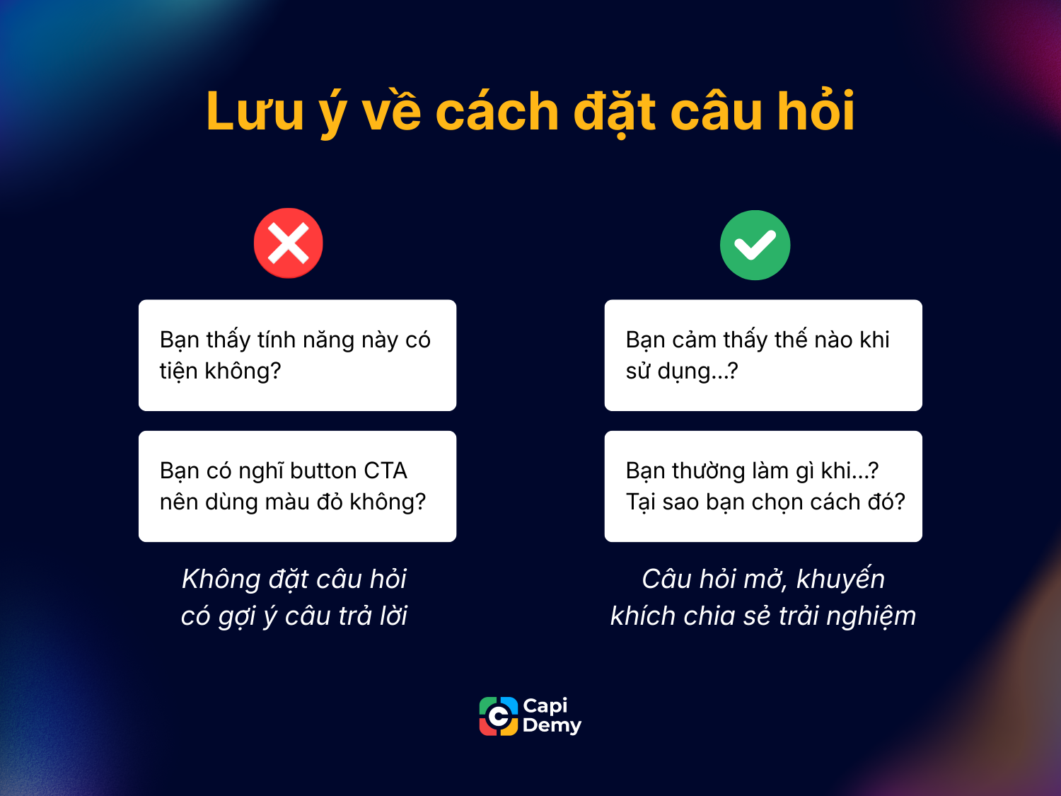 Các câu hỏi nên ở dạng mở để khuyến khích người tham gia chia sẻ trải nghiệm thực tế. Tránh các câu hỏi dẫn dắt hoặc khiến người dùng trả lời theo hướng bạn mong muốn.