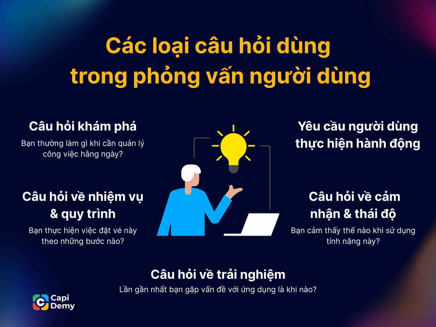 Tham khảo các câu hỏi phổ biến dùng cho user interview tại: A Cheatsheet for User Interview and Follow Ups Questions